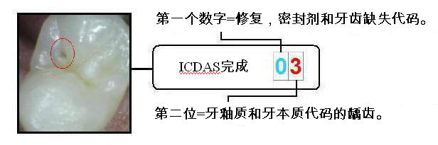 在这种情况下,第一个数字0表示牙齿表面为“未恢复或密封”;在这种情况下,第二个数字3表示牙齿表面为牙釉质和牙本质龋齿:“牙釉质完整性丧失<0.5mm。牙本质不可见”。每单位面积进行编码,必须知道牙齿表面的边界;以便扩大龋齿的登记标准化。 |