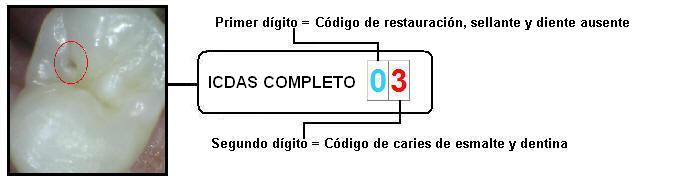 El primer  dígito en este caso el 0 identifica a la superficie de la  pieza dental como "No  restaurado ni sellado";  el segundo dígito en este caso el 3 identifica a la superficie de la pieza dental como caries de esmalte y dentina: "Pérdida de integridad del esmalte < 0.5mm., dentina no visible".  La codificación se realiza por unidad de superficie, los límites de la superficie dental deben ser conocidos; para que el registro de la extensión de caries sea estandarizado.