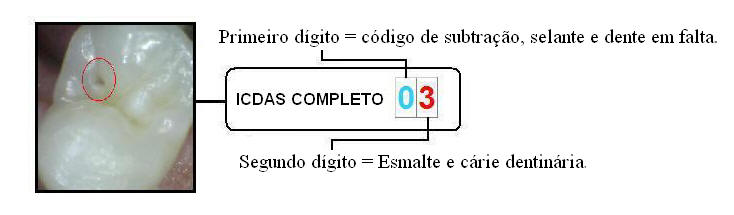 O primeiro dígito neste caso 0 identifica a superfície do dente como "Não restaurada ou selada"; o segundo dígito neste caso 3 identifica a superfície do dente como esmalte e cárie dentinária: "Perda da integridade do esmalte <0.5mm., a dentina não é visível". A codificação é feita por unidade de área, os limites da superfície do dente devem ser conhecidos; para que o registro da extensão da cárie seja padronizado.