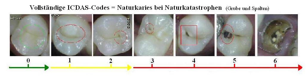 ICDAS Complete präsentiert 7 Kategorien, die erste für gesunde Zähne (Code 0, in Grün) und die nächsten zwei für Karies, die sich auf den Schmelz beschränkt, weiße / braune Flecken (Code 1 und 2, gelb markiert). Die folgenden zwei Kategorien (Code 3 und 4, rot) gelten als Karies, die sich ohne freiliegenden Dentin bis zum Schmelz erstrecken. Die anderen beiden verbleibenden Kategorien (Codes 5 und 6) betrachteten Karies mit freiliegendem Dentin. Siehe unteres Bild