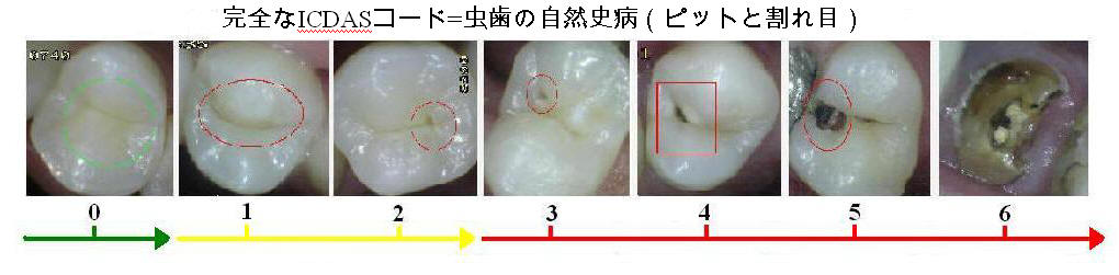 ICDAS II(国際齲蝕検出および評価システム)は、メリーランド州ボルチモアで合意された国際齲蝕検出および診断システムです。 2005年のアメリカ、臨床診療、公衆衛生プログラムの研究開発。目的は、できるだけ早期に虫歯を検出するための視覚的方法を開発し、さらにその重症度および活動レベルを検出することであった。 このシステムは、70〜85%の感度と80〜90%の特異度を持ちます。齲蝕の検出、一時的および恒久的な歯列この程度に応じて、試験スタッフのトレーニングの程度と調整が異なります。カッパ一致指数=> 0.65。 (Pubmed-Medline 19681984 - 18204251 - 19907175) ICDAS Completeは7つのカテゴリーを提示します。最初のカテゴリーは健康な歯のためのもの(コード0、緑色)と次の2つはエナメル質に限定された虫歯のためのものです。次の2つのカテゴリー(コード3と4、赤)は、象牙質が露出せずにエナメル質にまで及ぶ虫歯と見なされます。そして残りの2つのカテゴリー(コード5と6)は、象牙質が露出している虫歯と考えられています。下の画像を見る