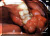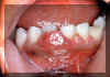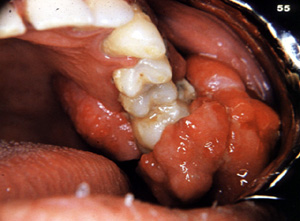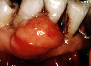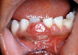 Este ejemplo es bastante vascular. Ha cambiado de sitio al incisivo central hacia lingual. Los granulomas de  celulas gigantes tienen un mayor potencial de crecimiento  que el granulomas periférico y puede cambiar de lugar  los dientes.
