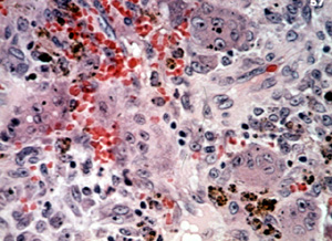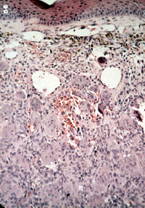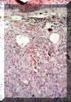 Hay un estroma  fibro-endotelial celular activo que contiene innumerables células gigantes bajo el epitelio. Note el pigmento castaño de la sangre inmediatamente debajo del epitelio. Las células gigantes que proliferan se debe a esta  hemorragia.