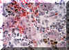 A mayor resolución se observan la configuración celular multinucleada de las células gigantes. Y además  contiene fibroblastos y células endoteliales.