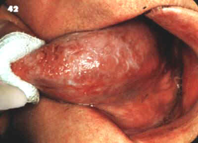 La cara dorsal de la lengua presenta (41) placas blancos con áreas intermedias de