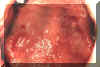 bien demarcadas cubiertas por exudado de color amarillento-gris. |