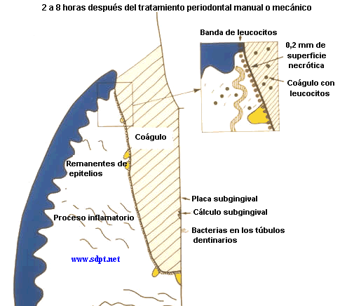 1. En el diagrama se observa que el epitelio de unión y el epitelio de la bolsa ha sido parcialmente eliminado durante el procedimento de raspaje, alisado radicular y curetaje, ya sea  realizado por método manual o por medio de ultrasonido; también se observa al  epitelio de la bolsa incluido en la matriz del tejido conectivo. El tratamiento resulta en una herida del tejido conjuntivo lateral al diente, que produce un sangrado hacia la luz de la bolsa conformando un coágulo. Una zona de la superficie de aproximadamente 0.2 mm de profundidad se necroza en el proceso curativo. En la superficie  la capa necrótica hace que aumente los leucocitos. Estas células proporcionan una protección contra el ataque bacteriano y también media como elemento curativo. El epitelio poco después empieza a proliferar para cubrir el tejido conjuntivo. La proliferación tiene lugar desde el margen gingival. Los estudios actuales han documentado que islas de cálculo y  placa  subgingival puede permanecer en la superficie de la raíz  después de un tratamiento cuidadoso. También las bacterias pueden haber invadido los túbulos dentinarios. Las bacterias  subgingivales restantes son una de las razones biológicas para la necesidad de tratamiento posterior. (periodontitis refractaria al tratamiento)
