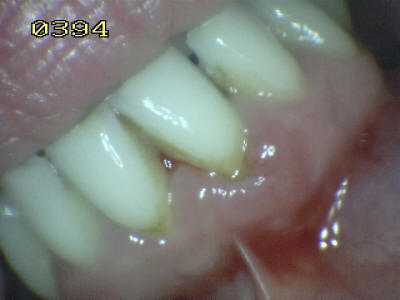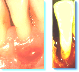 Mujer de 45 años de edad, que se queja de dolor a las 3 semanas después del raspado y alisado radicular. Ella ha mantenido una buena  higiene oral en relación con el tratamiento. El margen  gingival había sanado y el tejido se adaptó  estrechamente a la supericie dental en la región coronal.  Se observa una fístula como resultado de un absceso periodontal.  El diagnóstico clínico de absceso periodontal era basado en el siguiente criterio: