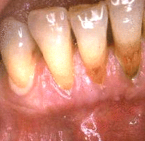 Mujer de 64 años de edad con  enfermedad periodontal severa en los dientes anteroinferiores. Al sondaje de la bolsa periodontal presentó una profundidad de  5-8 mm. En el  examen inicial al sondaje suave  presentó  flujo de pus en el margen gingival. La imagen ilustra un síntoma prominente de la enfermedad periodontal severa.