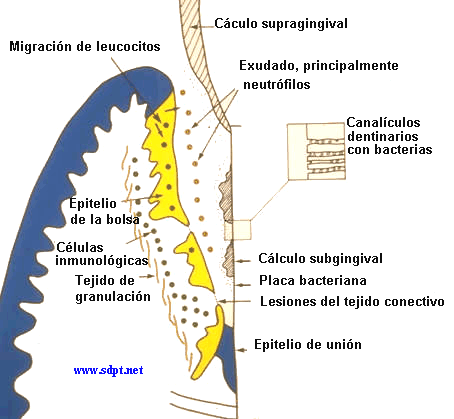 3. Además la investigación actual ha demostrado que las bacterias subgingivales también pueden invadir los túbulos o canalículos dentinarios en áreas donde el proceso de la enfermedad ha quitado el cemento. Tales depósitos dentinarios pueden favorecer la  recolonización bacteriana después del tratamiento. La formación de cálculo subgingival crea superficies para la colonización bacteriana y el cálculo subgingival puede contribuir indirectamente a la etiología de la periodontitis. Ocurre una  migración continua de leucocitos en la bolsa periodontal, hay leucocitos polimorfonucleares  que predominan en el exudado celular. Los leucocitos forman una pared entre el  tejido  gingival y la superficie del diente asociada a la placa bacteriana dental. Los leucocitos protegen al tejido gingival de una  invasión mayor de bacterias, hay sólo un epitelio corto de unión en el fondo de la bolsa periodontal, que en ocasiones se encuentra ulcerado.