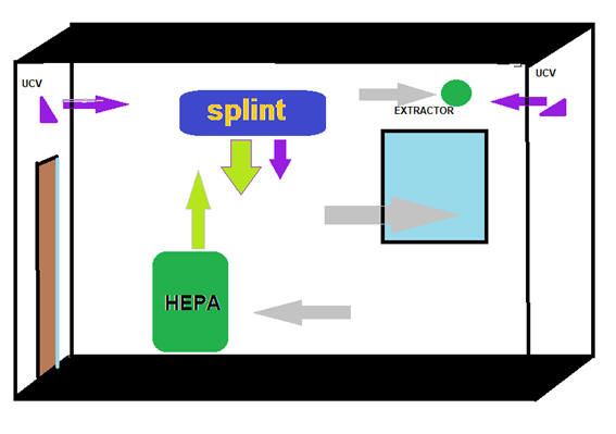 Dibujo inferior  muestra la combinación  de los diferentes dispositivos para la higiene del aire, como es la luz ultravioleta germicida, la ventana de más de metro de sección, el extractor de are y la unidad autonoma  de filtrado de particulas PM2.5 con filtros HEPA. ó MERV-13