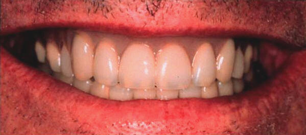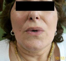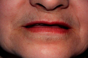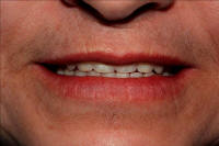 La unión de la mucosa oral  solamente debe ser visible cuando los labios son ligeramente separados. Si no es visible hay insuficiente soporte. Fotografía derecha.