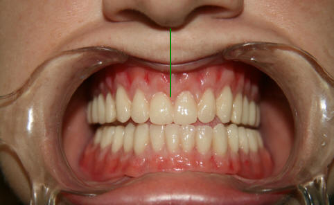 F- Línea media:  de los incisivos debe corresponderse con la línea media del rostro del paciente, puede tener un desvío de un milímetro a la derecha o izquierda., para parecer mas natural