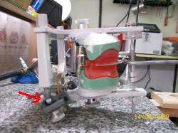 El articulador a 7Ffix al tener la traba en céntrica, no es necesario la utilización de gomas elásticas para que los cóndilos toquen el techo y la pared posterior de las cajas glenoideas durante el montaje del modelo inferior. En el articulador semiajustable clásico Ver flecha roja imagen  abajo izquierda  Este es un error muy común durante el montaje de modelos.