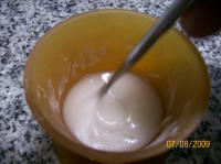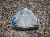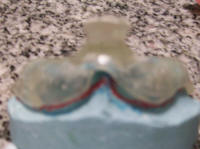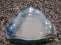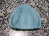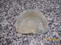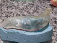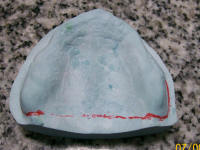 Recorte de la lámina de acrílico más allá del diseño de la cubeta Cubeta ya recortada. Se utiliza acrílico de auto curado transparente para darle fortaleza. Se agrega a una parte del monómero y 2 partes de polímero, y se mezcla en forma suave para no incorporar burbujas a la mezcla.