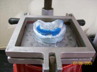 Se coloca el modelo sin retenciones en la termo formadora al vacío. Se enciende el calentador eléctrico y se espera hasta que por gravedad la lámina tenga una curvatura de 2 a  3 cm. Se enciende el vacío, se baja el porta láminas en forma rápida en un solo movimiento. Placa acrílica ya ajustada al modelo, lista para ser cortada con disco aserrado.