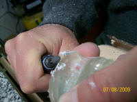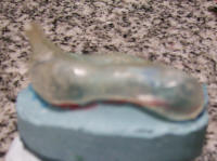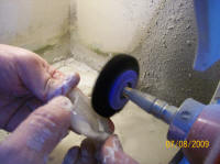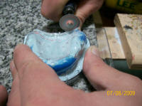 Retocado de la cubeta hasta los bordes del diseño.  Este paso se realiza con un fresón para acrílicos. Pulido con cono  y pasta de  pómez Para disminuir las asperezas, utilizamos un cepillo de 4 hileras y pasta de pómez espesa.
