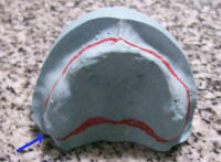 Marcando zona retrocigomatica derecha, en la tuberosidad existe una zona retentiva Se observa un frenillo vestibular de inserción muy alta Aquí se observa la zona retentiva de la tuberosidad derecha (Flecha azul) Desgaste del modelo en la zona de la línea de la "A" con forma de mariposa