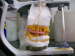 Una vez conseguida la desoclusión posterior con las laminillas, se le agrega unas 10 laminillas (1000 micrones = 1 milimetro de espesor adicional) durante el registro de "cera en céntrica"; durante esta maniobra el paciente nunca debe cerrar la boca sin las laminillas. Se espera a que la cera tome la temperatura de la boca del paciente 35º a 40º C  (B) y se retiran las laminillas de Long,. Para evitar que el fulcrum anterior provoque un registro compresivo (registro de cera en céntrica, que en la actualidad es considerada una posición límite y no terapéutica). Se le indica que muerda el registro suavemente hasta una profundidad de 1 mm. (C) (que es el espesor agregado con las últimas laminillas). Se retira el registro en cera de la boca  y se observa que no haya perforaciones, lo cual indicaría un contacto posterior. Si los hubiere debe realizar nuevamente el registro.