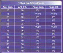 tabla de articulación dental del fabricante; que dientes antero