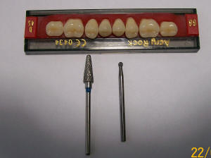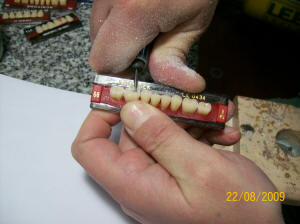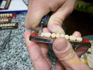 Se necesita un fresón cónico de caras planas, y un fresón redondo de acero.  El tallado de los dientes se realiza en el soporte plástico. El tallado debe ser plano eliminando la altura cuspidea
