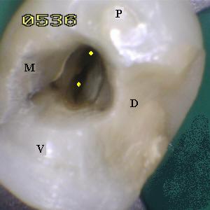 Este diente en el 95% de los caso es birradicular. los orificios de entrada de los conducto, que generalmente son dos, se encuentran por debajo de las vertientes interiores de las cúspide; como se muestra en la figura derecha.