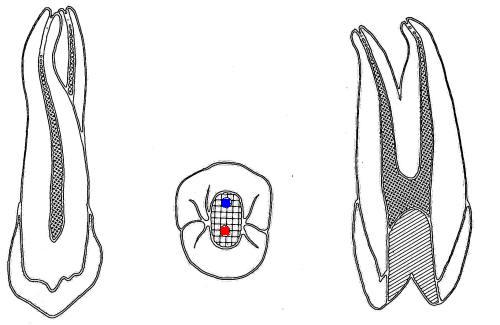 Es todo un enigma para el dentista, porque suelen tener conductos dobles que se dividen a diferentes niveles. El acceso se lleva a cavo en una posición ligeramente vestibular en relación al surco central., como indica la figura derecha. La cámara pulpar ovoide es alcanzada con fresa de fisura de extremo cortante y luego fresa redonda número 4 ó 6 de tallo largo.