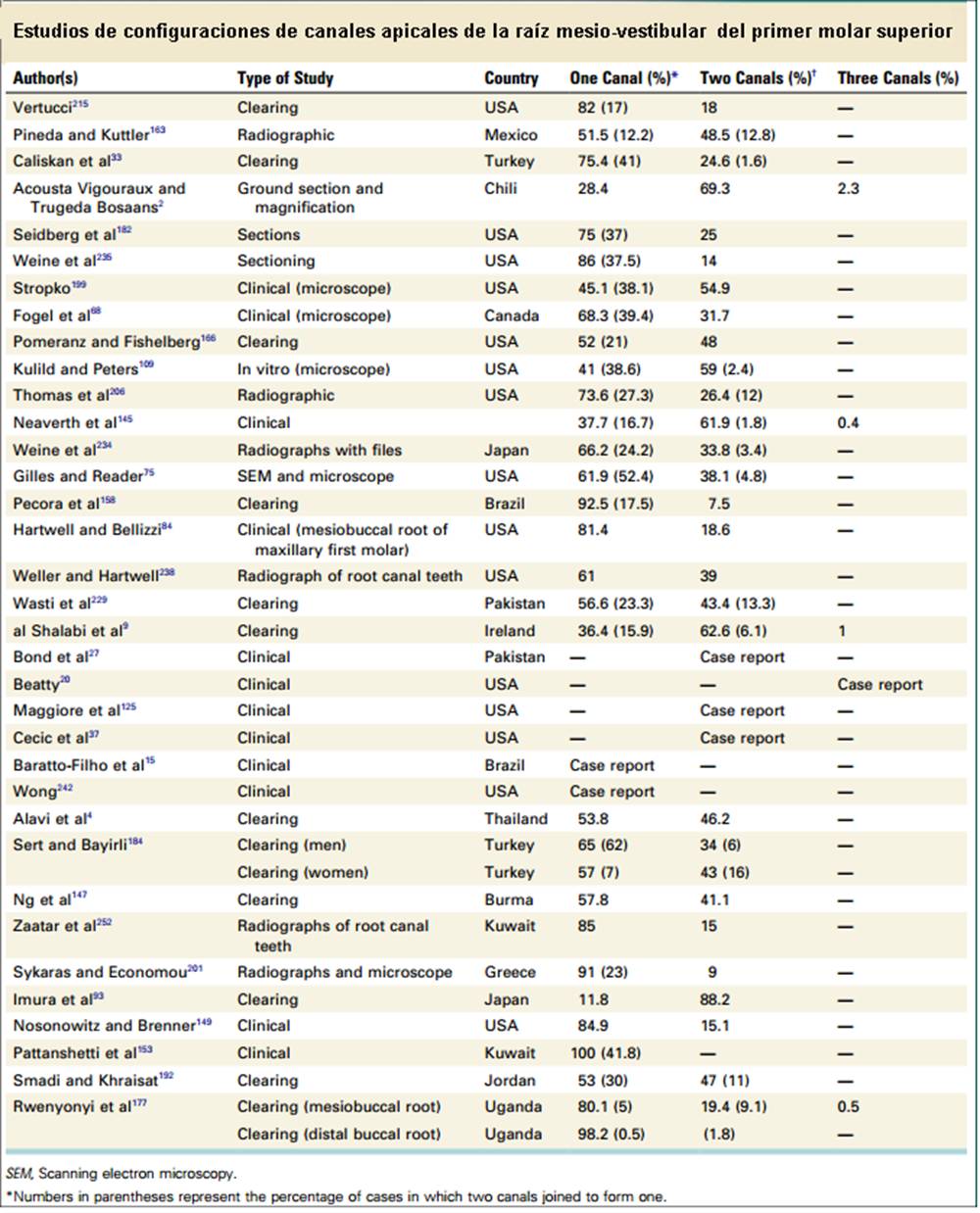 La raíz mesiovestibular es achatada en sentido mesiodistal y amplia en sentido vestibulopalatino.El conducto mesiovestibular con frecuencia es curvo y de sección en forma de hendidura. La existencia de dos conductos en esta raíz, puede presentar la siguiente configuración: