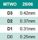 Puede llevar el irrigante a la zona de trabajo con una aguja Gauge 27 que tiene un calibre de 0,4 mm. cuando se a realizado la conformación del conducto con una lima rotatoria Mtwo ISO 25/06  Ver tabla derecha