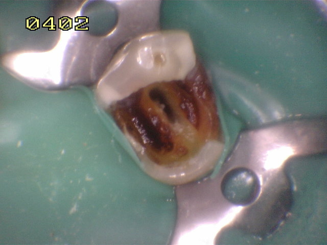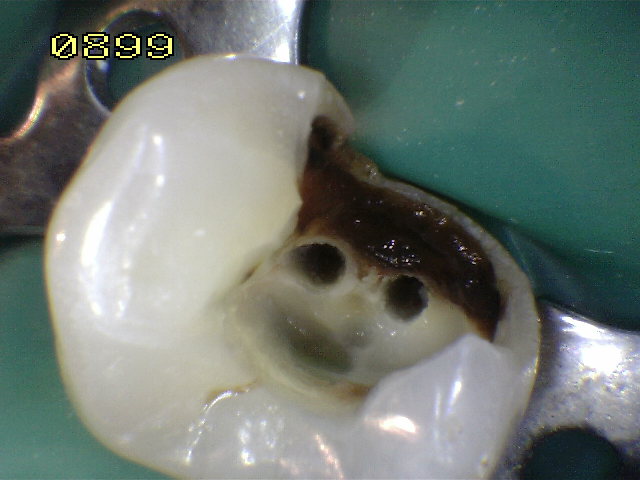 Un solo conducto de inicio y caries extensa en mesial , distal y palatino. |