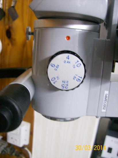 El microscopio tiene enfoque manual bilateral por medio de una perilla en forma pentagonal de color negro (Micrómetro). Y para cambiar los aumentos hay una perilla bilateral, que se gira para adelante  o atrás. Notamos que tiene una secuencia establecida para realizar endodoncia, ( 4x, 10x, 16x y 25x )  y otra para la operatoria dental (4x, 6x y 10x)